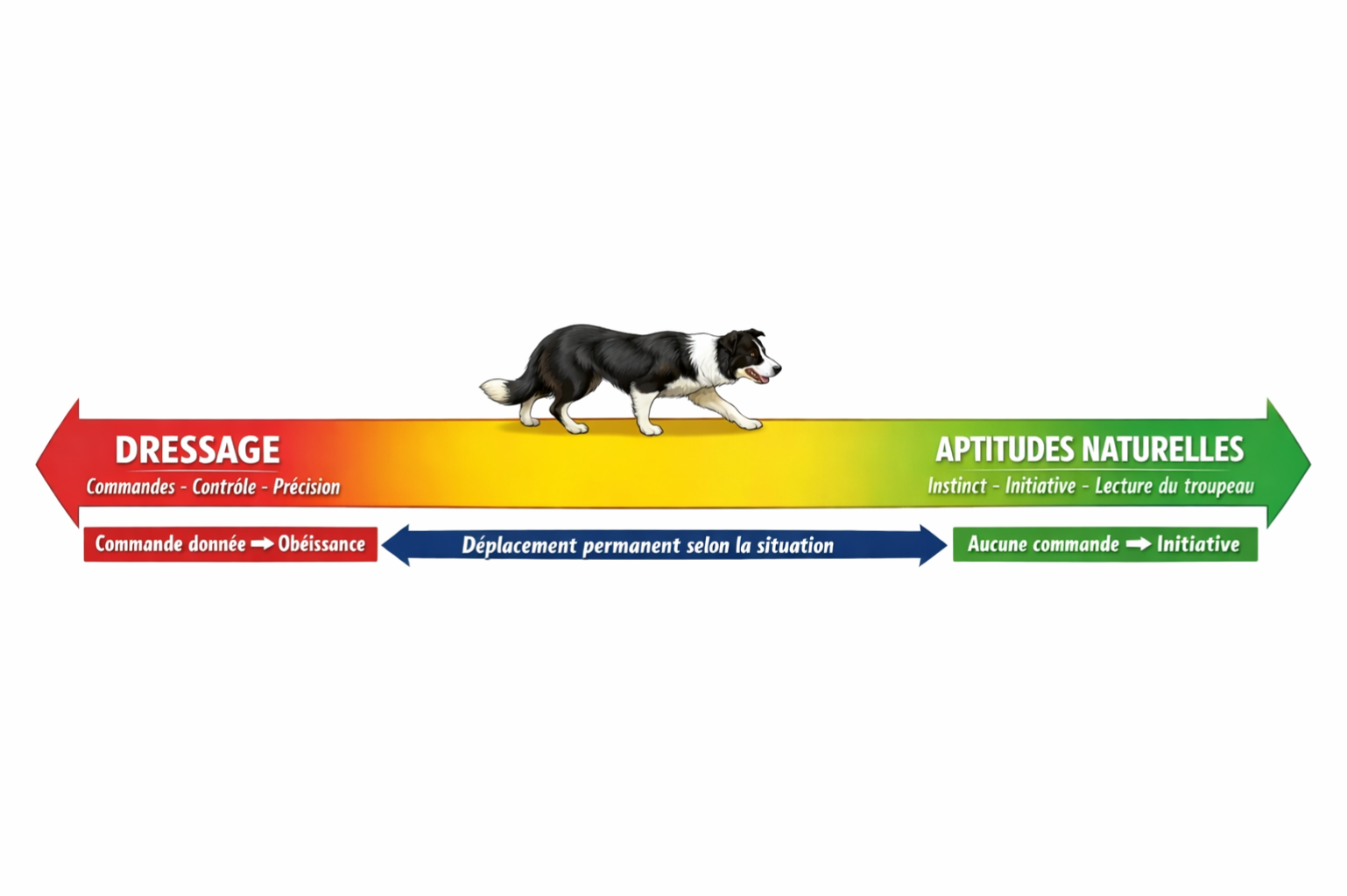 - Les aptitudes naturelles du Border Collie, héritées de sa génétique (instinct de rassemblement, pression, équilibre, et lecture du troupeau).